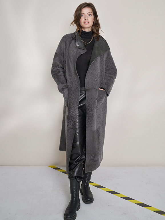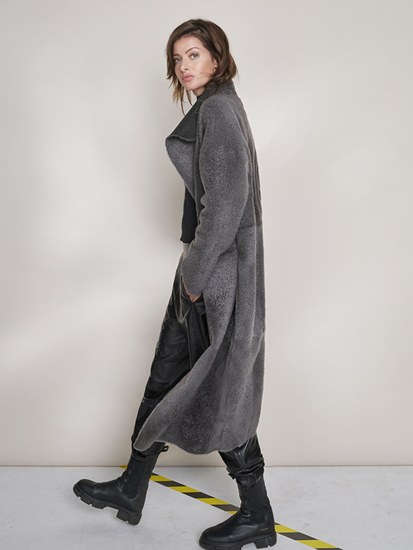 The Cora lambskin coat combines casual lines with sophisticated details. The straight cut with dropped shoulders ensures a relaxed fit, while the stand-up waterfall collar and concealed press studs create an elegant overall look.