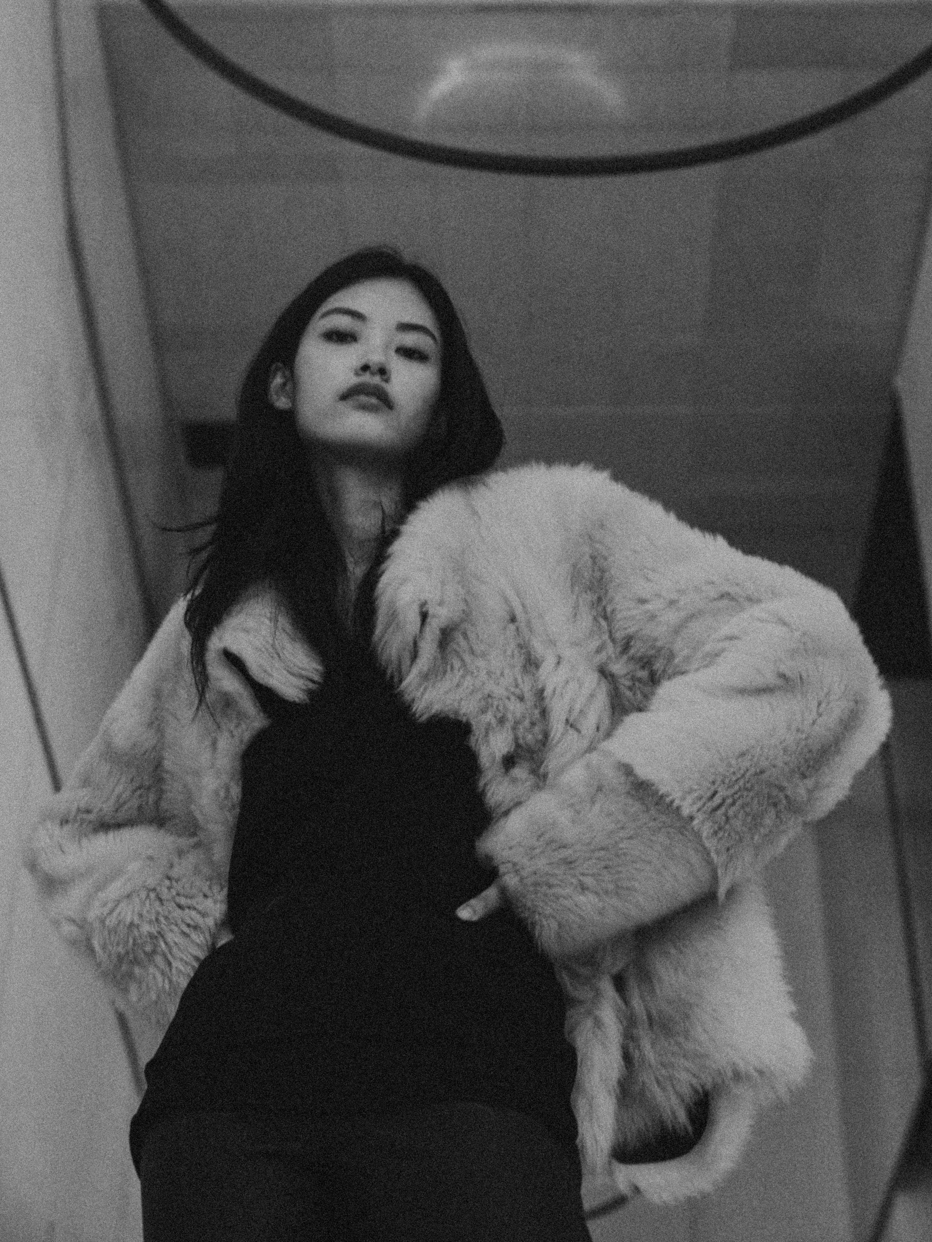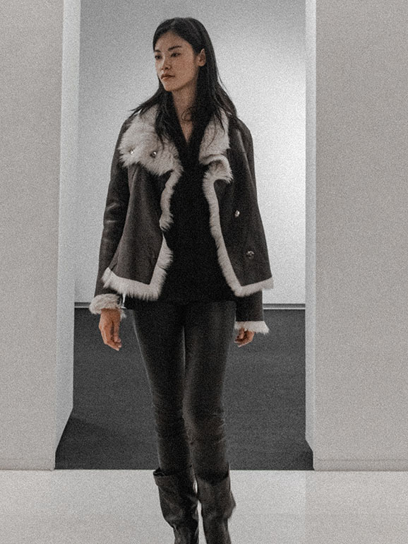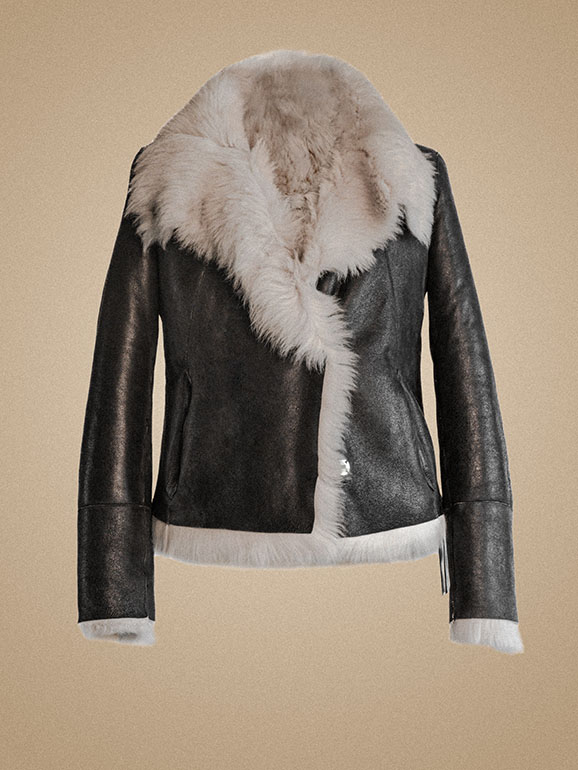 Toscana lambskin with long, fluffy hair and patina leather